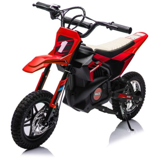 Comfort en veiligheid staan centraal bij deze elektrische crossmotor voor kinderen. De twee handremmen die de schijfrem voor en trommelrem achter bedienen zorgen voor nauwkeurig remmen, terwijl de achtervering en het kunstlederen zitje zorgen voor een comfortabele rijervaring, zelfs op ruwer terrein. De rubberen luchtbanden bieden optimale grip en stabiliteit en de kettingaandrijving met beschermende kettingkast verhoogt de veiligheid tijdens het rijden. Met zijn robuuste design en sportieve uitstraling is deze rode elektrische kindermotor de ideale keuze voor kinderen die dromen van hun eerste echte crossavontuur.