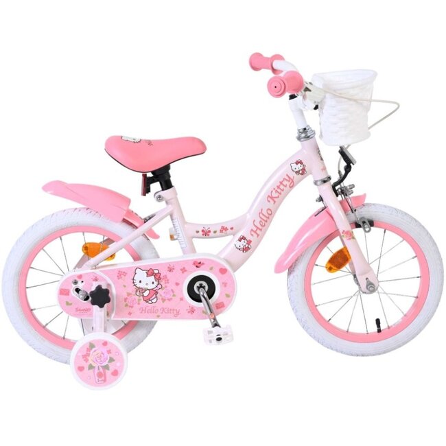 De Volare Hello Kitty kinderfiets 14 inch roze is de perfecte meisjesfiets voor jonge fans die veilig én stijlvol willen leren fietsen. Deze vrolijke Hello Kitty fiets is speciaal ontworpen voor kinderen van ongeveer 3 tot 5 jaar. Dankzij de afneembare zijwielen biedt deze 14 inch kinderfiets extra stabiliteit tijdens de eerste fietsavonturen. De combinatie van een terugtraprem en handrem helpt kinderen stap voor stap vertrouwd te raken met remmen, terwijl het verstelbare stuur en zadel zorgen dat de fiets comfortabel meegroeit.