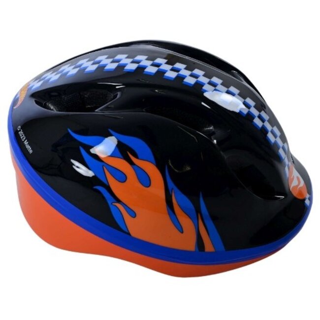 Volare Kinderfietsen beschikt over een grote collectie licentie helmen. Een daarvan is deze prachtige Hot Wheels fietshelm. De zwarte kleur en de race decoraties geven de helm een perfecte uitstraling. Met de draaiknop is de hoofdomtrek van de helm verstelbaar van 52 tot 56 cm. Daarbij is de onderkant van de helm ook bedekt. De helm weegt slechts 200 gram. Dat maakt hem extra licht en dus makkelijk te dragen. De helm is naar de strengste eisen van het TÜV/GS goedgekeurd.